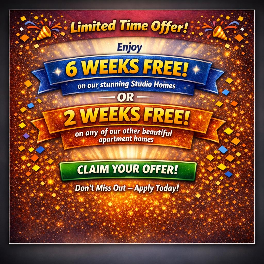 Enjoy 6 WEEKS FREE on our stunning Studio Homes OR 2 WEEKS FREE on any of our other beautiful apartment homes! Donβt miss out on these incredible savings β these offers are available for a short time only! π Call today to schedule your tour or get full details. Your new home is waiting!